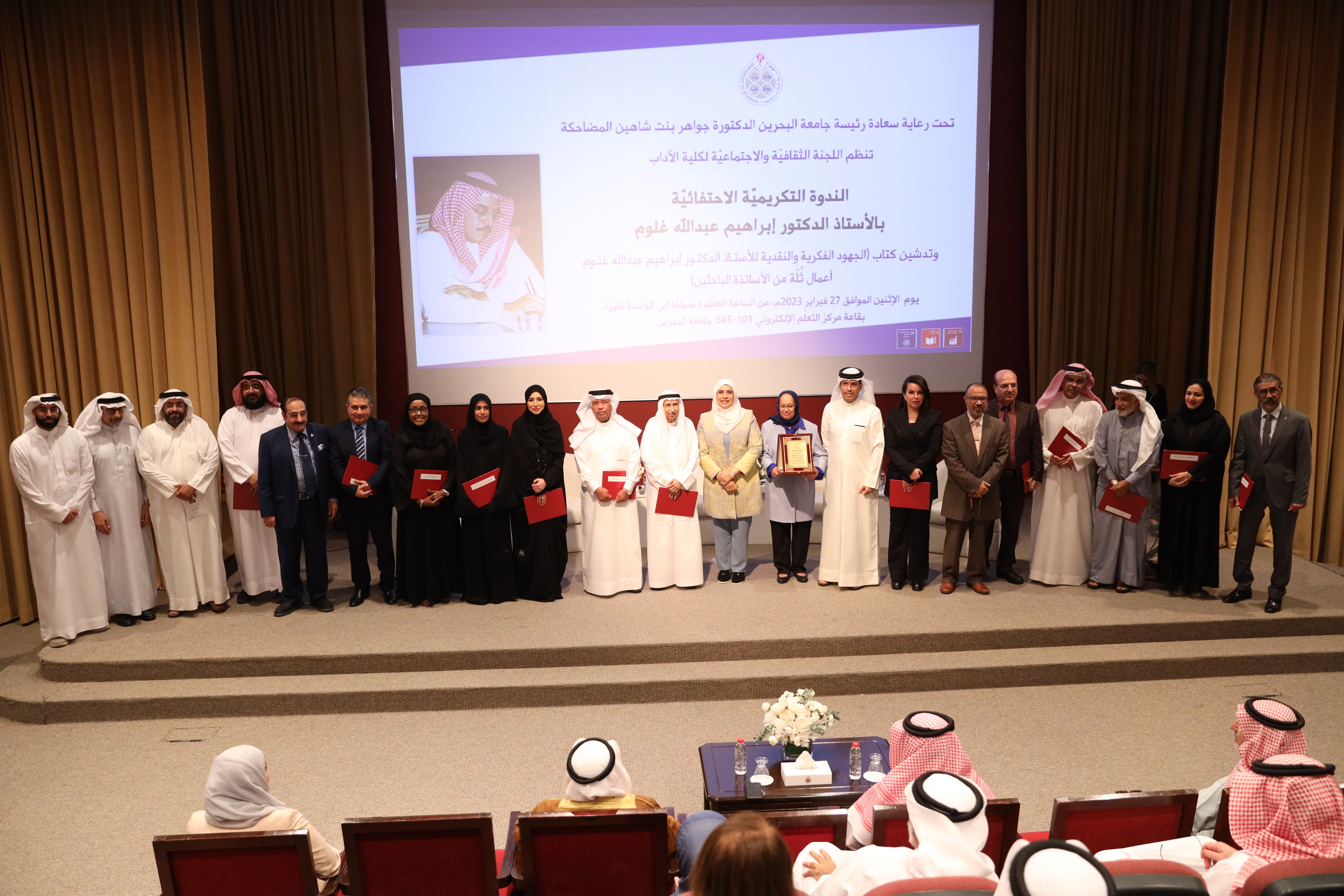 شهدت تدشين كتاب عن جهوده الفكرية والنقدية أعده فريق من الباحثين جامعة البحرين تقيم ندوة احتفائية بالمنجز النقدي للدكتور إبراهيم غلوم د. المضاحكة: تجربة أ.د. غلوم الثرية تضيء الطريق للباحثين الشباب