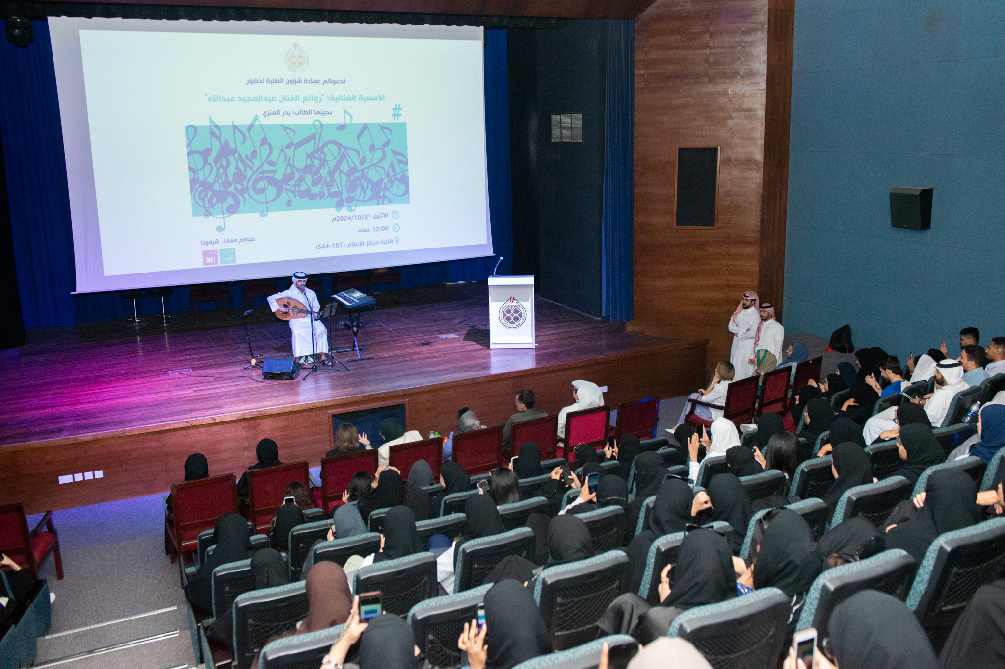 The Deanship of Student Affairs at the University of Bahrain presented a public singing performance titled “Masterpieces of the artist Abdulmajid Abdullah.” The event, part of the university’s music club activities, featured student Badr al-Anzi and was open for the wider community to enjoy.