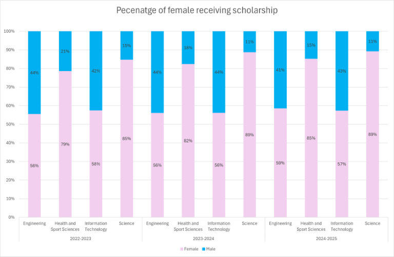 The chart below shows strong female representation in scholarships across underrepresented fields from 2022–2025. Engineering maintains ~56% female share, Information Technology ranges 56–58%, and Science reaches 85–89%. Health and Sport Sciences records 79–85%. These figures evidence targeted measures that attract and support women in STEM and related disciplines, aligning with SDG 5 and institutional gender equity goals.