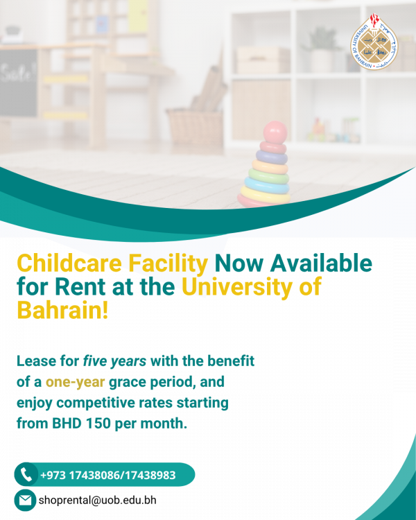 The official poster (see image) confirms the availability of childcare facilities at the University of Bahrain, including contact information and QR code for application.