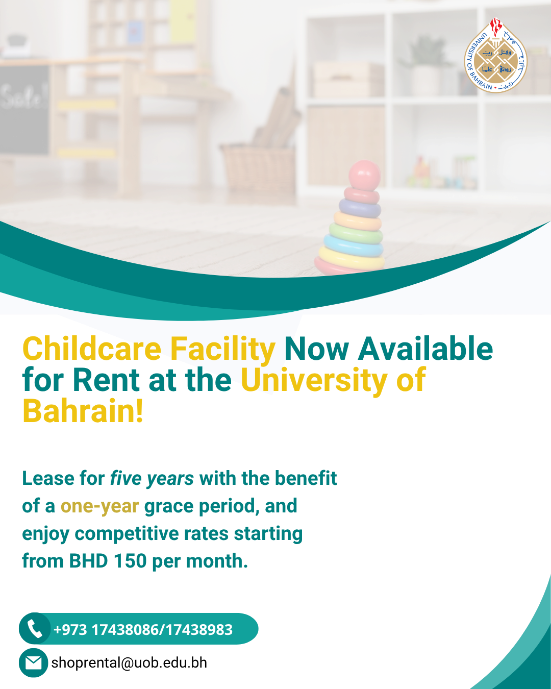 Students and staff wishing to benefit from UOB’s on-campus childcare facility or nearby licensed nurseries may contact +973 17438086 / 17438983 for guidance and support in identifying suitable options and completing application procedures.