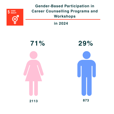 - Both academic advising and career counselling programs are open to all students, with female participation consistently above 50%.
