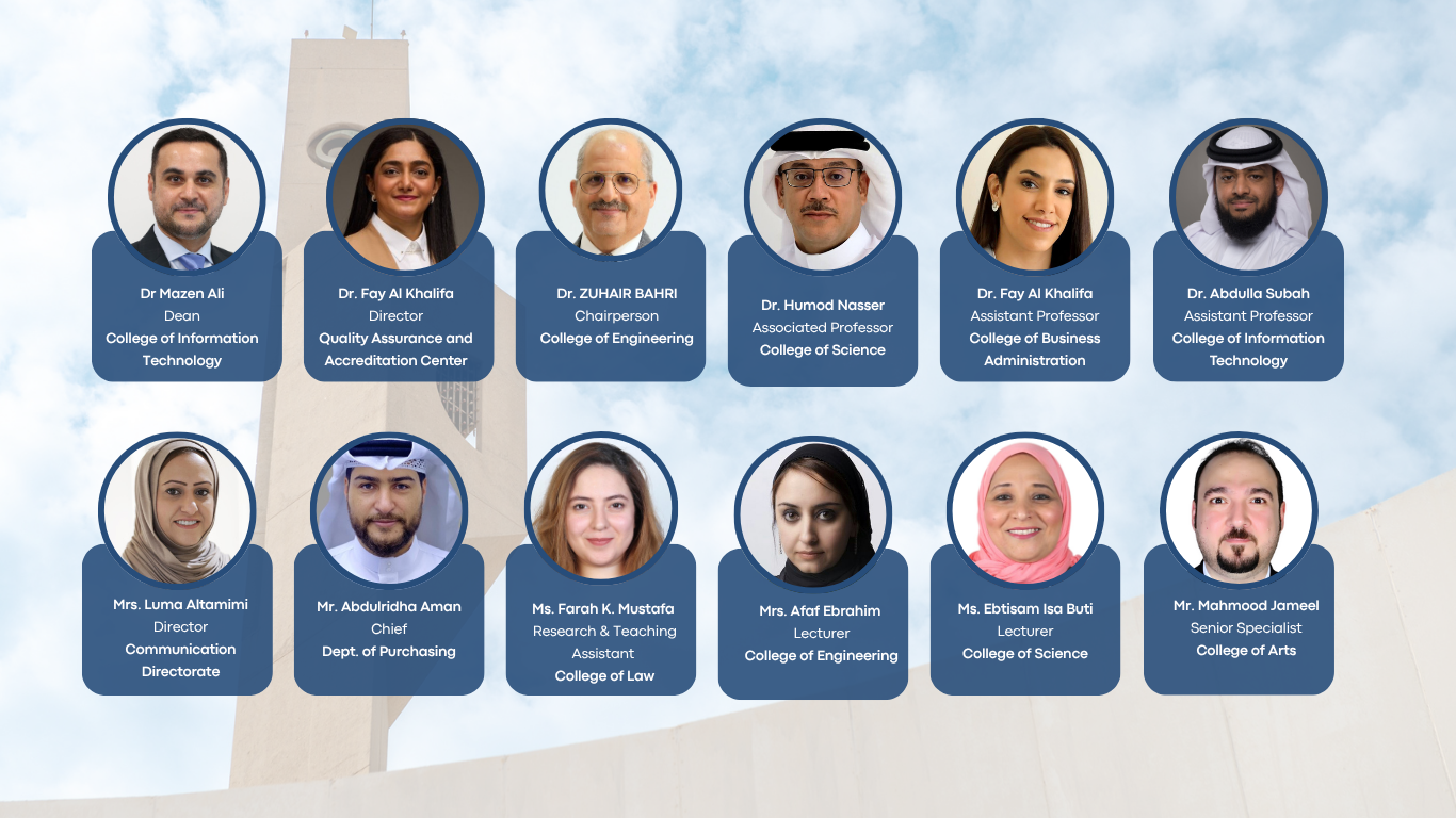 A Sustainability Committee is formed at the University of Bahrain, chaired by Dr. Mazen Mohammed Ali (Dean of College of Information Technology), and includes 12 members from various colleges and departments, consisting of faculty, administrative staff, and a student representative.